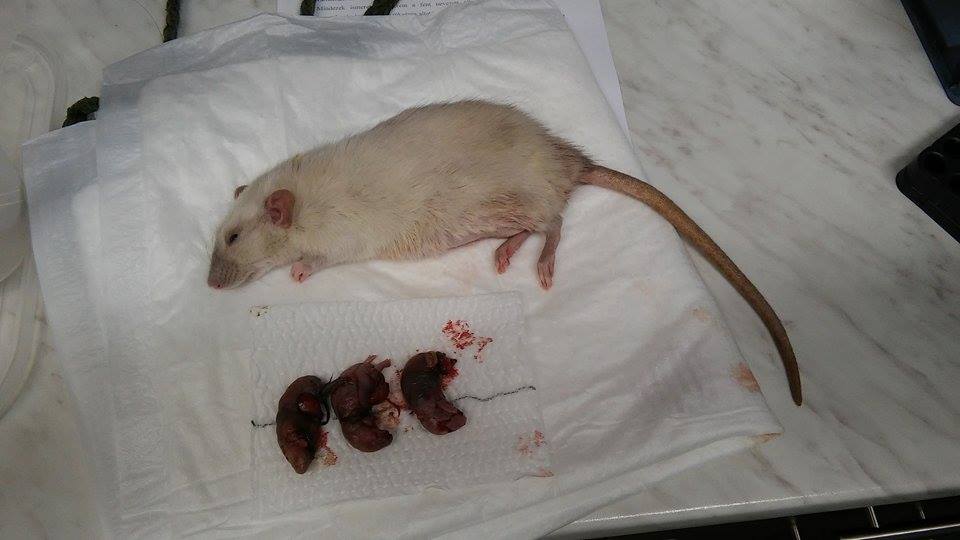 Nemrég Miskolcról egy nagyon barátságos patkány került hozzánk, aki nem tudott megfialni. Vérzett a hüvelyéből és bár gyógyszeresen ellátták a műtétre hozzánk utazott. Elvégeztük a kisállaton a császármetszést, de sajnos a magzatok már nem éltek. Az anyaállat rendben felébredt a műtét után hazamehetett.